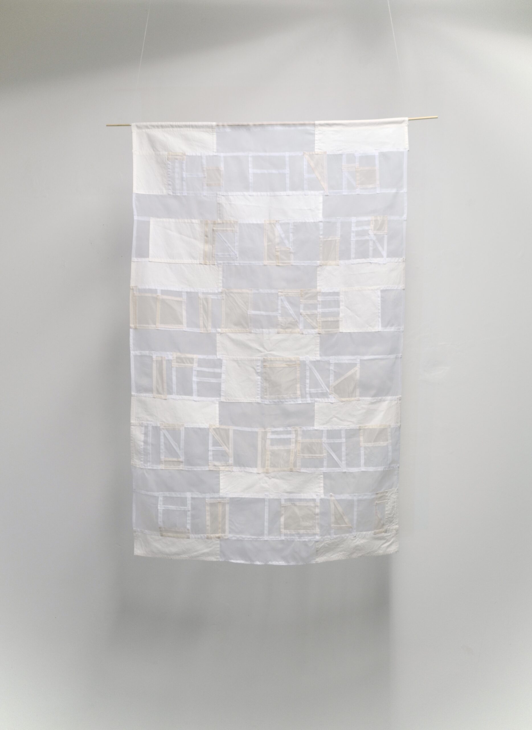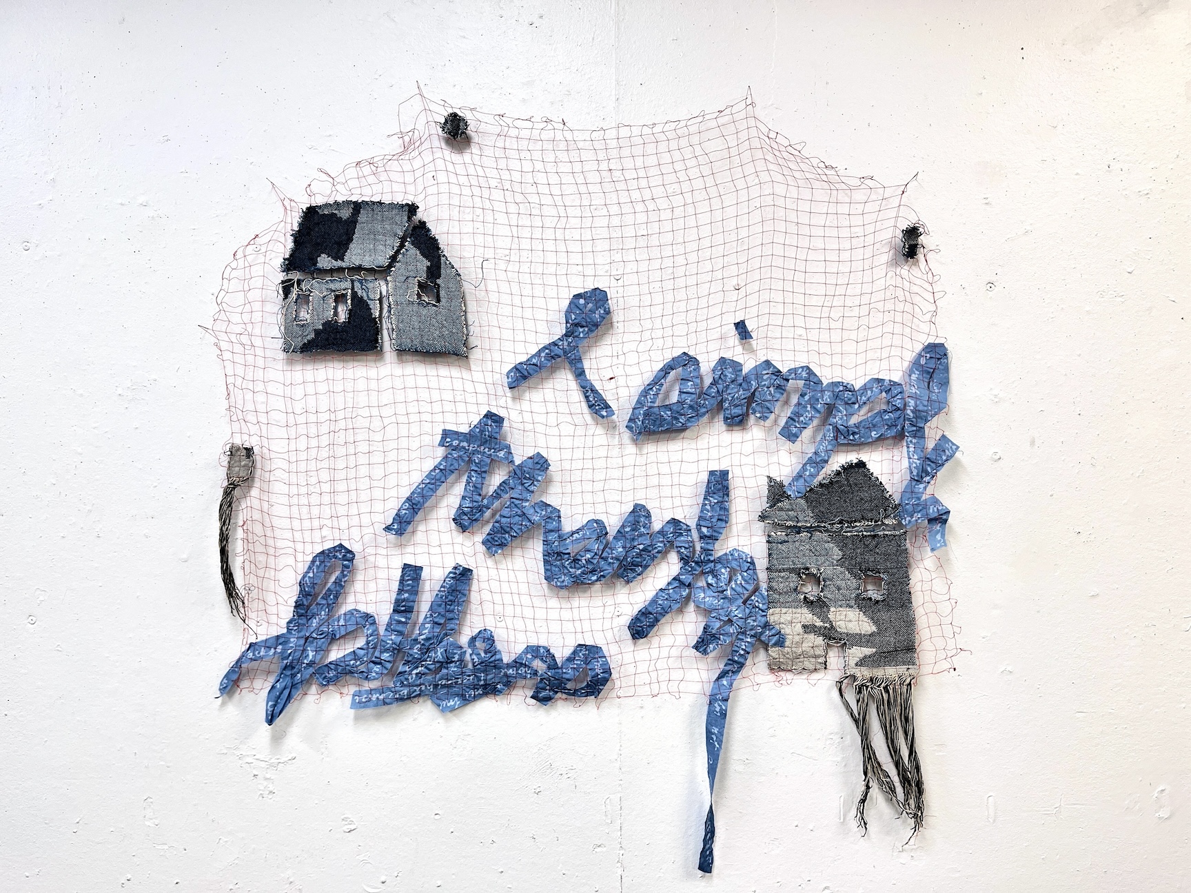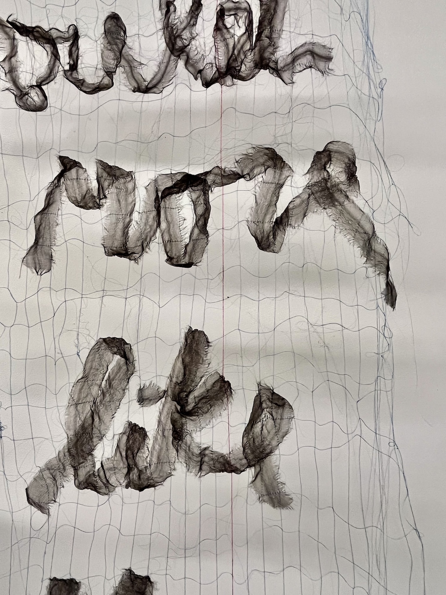 Chika articulates the gridded and linear structures of writing and cloth as armatures through which to physicalize the felt experience, to operate as bones to stand on, a net to catch. Chika’s works are thus in reciprocal dialogue with found literature and poetry, as well as with their own writing. She subverts the written word’s typical function of clear, quick communication: instead, text is folded into seams, dissolved into fray, suspended between stitches, or looped back on itself in knitted structures. Writing thus becomes an embodied vehicle for slowness, coaxing the viewer to lean in, slow down, and develop their own intimate relationship with the language in front of them.