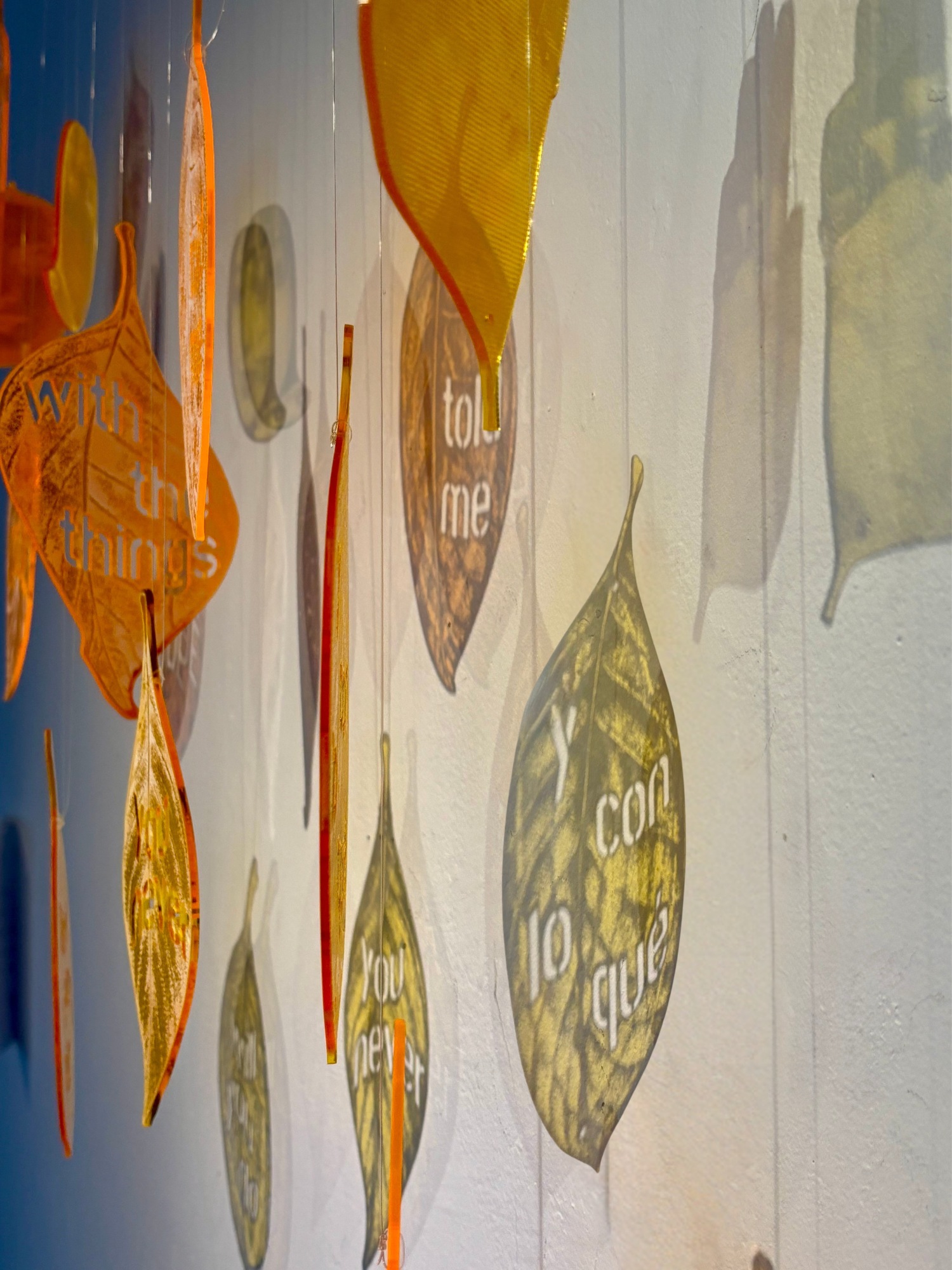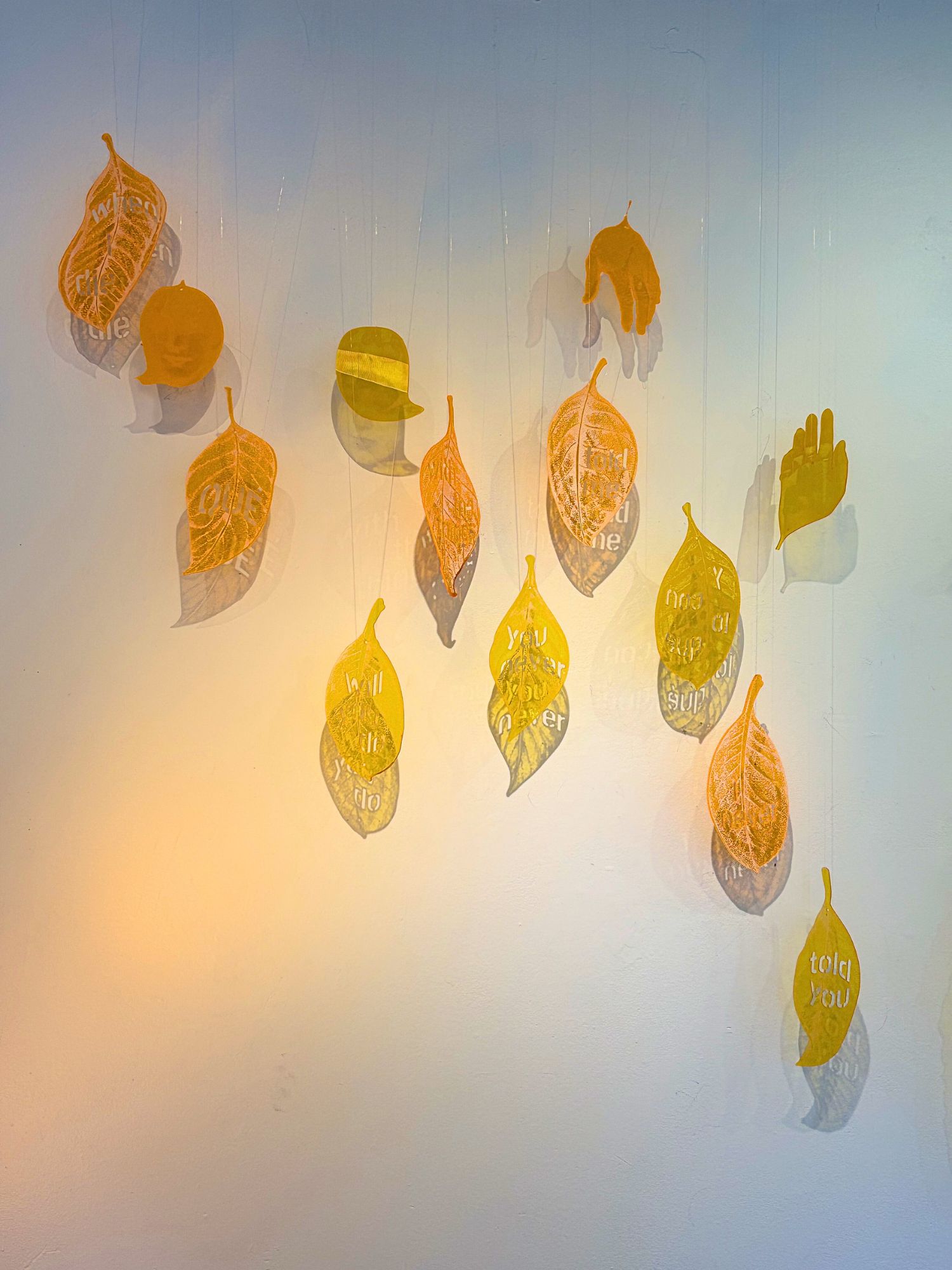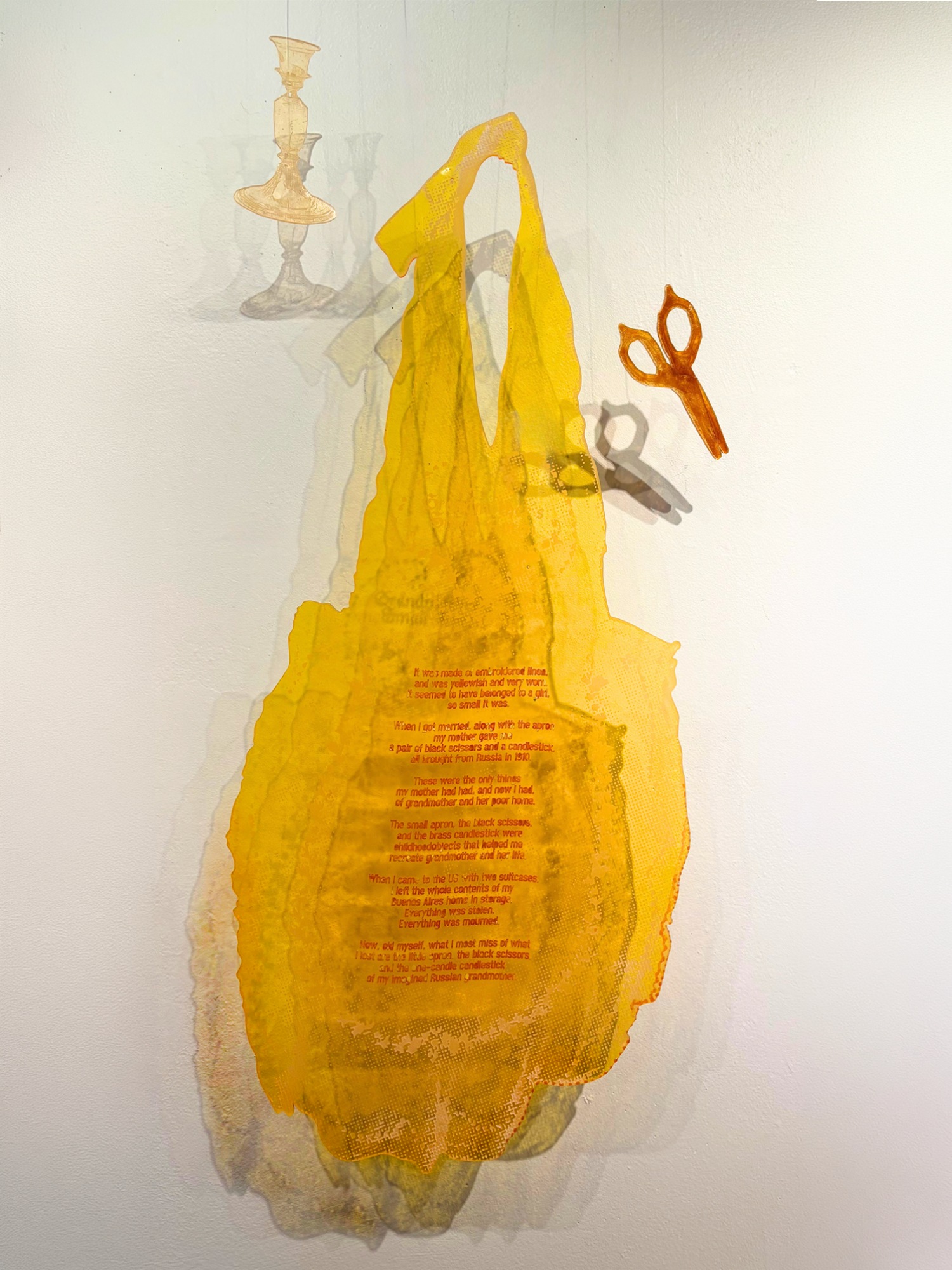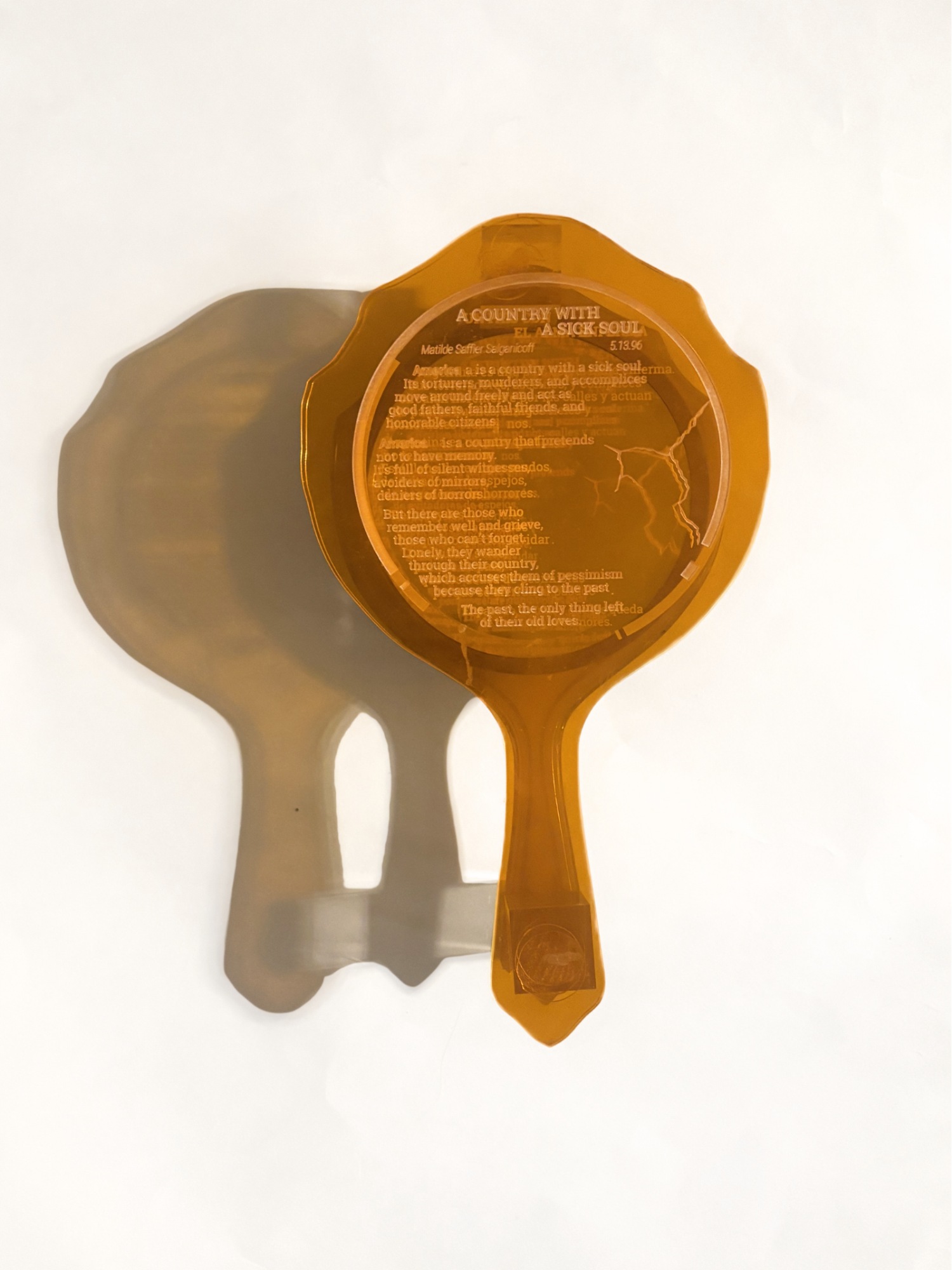 The installation moves left to right through accumulating registers of intimacy and interrogation. Immigration testimonials and heirloom jewelry give way to Memorianolia — a conjured mourning site of suspended amber and orange acrylic magnolia leaves carrying bilingual fragments of What Never Happened, casting shadows that outlast the objects themselves. The Grandmother’s Apron Assemblage follows: a found apron sourced by chance at a street market, an almost exact match to the one Matilde describes in her poem, reconstituted alongside laser-cut amber acrylic scissors and candlestick — the objects stolen from storage when she immigrated to the United States, speculated back into existence as an act of repair. Further in, the installation turns interrogative: Lavanderia de Memoria, chiffon pieces printed with AI-generated portraits of my grandmother conjured from my own descriptions and photographs, confronts the limits and violences of machine conjuring as a stand-in for ancestral memory. What does it mean to ask an algorithm to imagine her face, to wash and rewash a memory through a machine that has never grieved? Alongside it, a fabricated acrylic suitcase box spills AI-generated portraits, and Nose Approximation Box interrogates the inherited physiognomy of Jewish identity, the nose as archive of ancestry, of racial marking, of the body as a site where diaspora leaves its traces. Avoider of Mirrors engraves Matilde’s indictment of Argentina’s culture of forgetting onto a hand mirror made illegible as a reflective surface, its text substituting America for Argentina, insisting that the cycle is not past. Her complete works anchor the far end of the space alongside a reading chair, acting as a deliberate space where her poetry exists without my speculation layered over it, and where she gets the last word as a thank you from me.